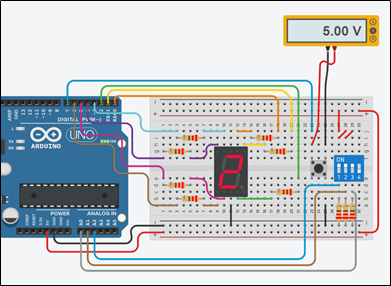When the push-button is pressed and released, the Arduino Uno counts from 0 to 9 on a common cathode seven segment display. The numbers change at a rate defined by switches states, Table 2.