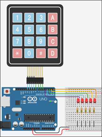 This activity uses a keypad 4x4. Five LEDs are connected to the Arduino Uno. The LEDs are turned on / off by the keypad. (50 minutes)