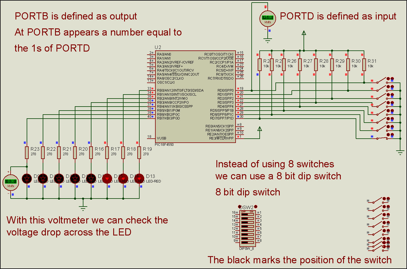 Step 4. By turning ON and OFF the switches connected to PORTD we form an 8 bit number. We check that the multitude of the 1s at PORTD is shown on PORTB