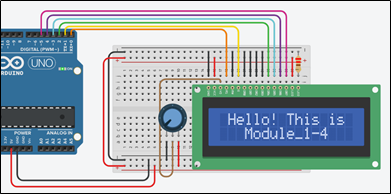 In this part the aim is for the Arduino Uno to display the message "Hello! This is Module_1-4 "on the LCD.