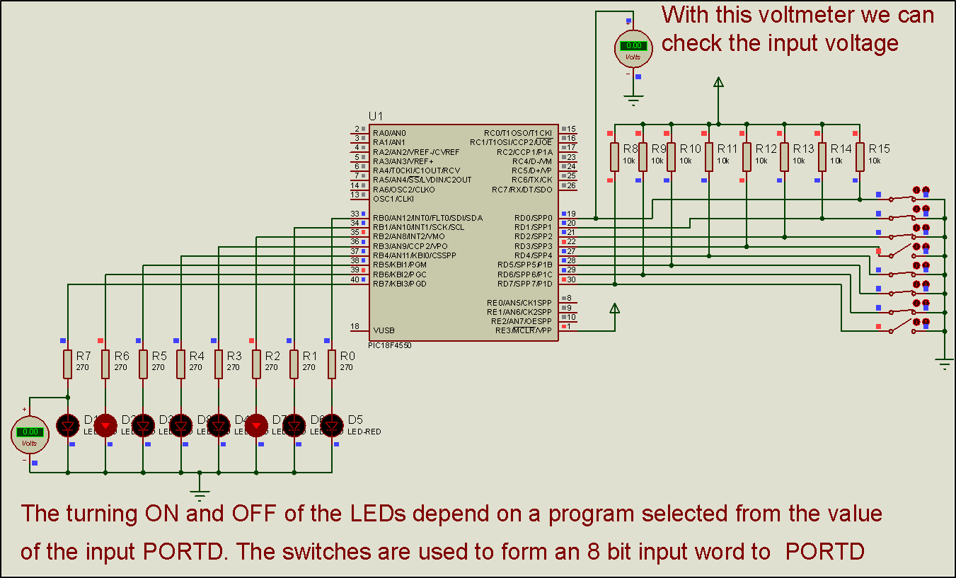 The purpose of this activity is to program the microcontroller so that the LEDs connected to PORTB turn ON and OFF in accordance with a program selected with the switches connected on PORTD.