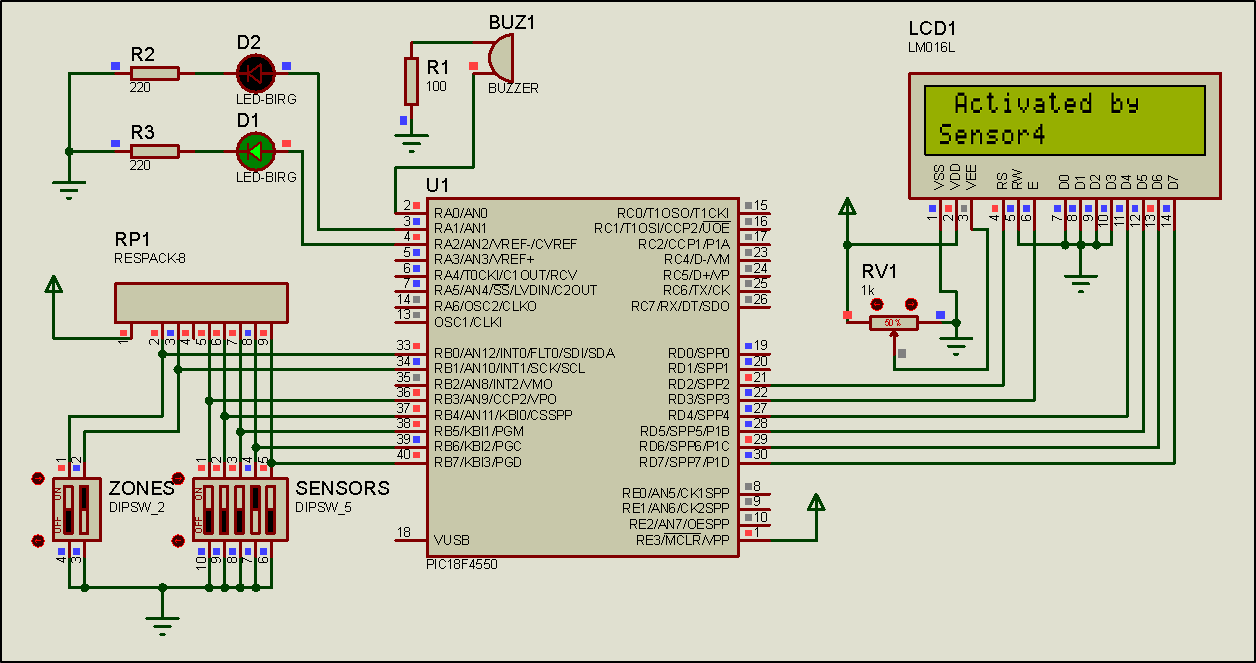 The purpose of the activity is for the PIC18F4550 to function as a simple alarm system. The microcontroller uses a 16x2 liquid crystal display as output device. Instead of magnetic reed switches, dip switches are used.