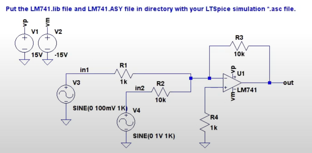 Plot the input and output waveforms (simulation vs. time - .tran ) for the assumed combination of shapes and amplitudes. Verify the operation of the signal adder.